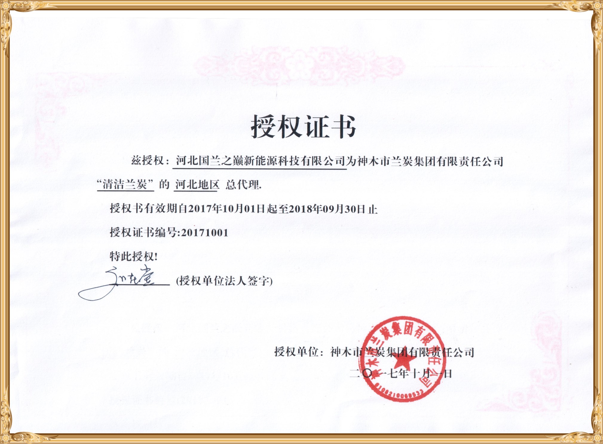 祝贺我公司获得神木兰炭集团授权证书